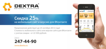 Напомним, до 25 октября 2012 года интернет-агентство Дэкстра предлагает разработку мобильного сайта или версии для ВКонтакте со скидкой 25%.